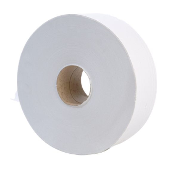 2 ply white jumbo toilet roll. Recycled tissue. High capacity roll, ideal for high traffic areas. 300m per roll, 6 rolls per case.
