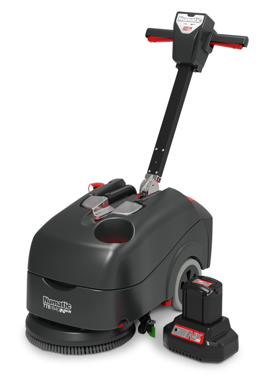 A compact battery scrubber dryer, designed to clean floors quickly and effectively in small areas. Compact & manoeuvrable. 36V Li-ion battery. 100W vacuum motor and 175W brush motor. 18L solution capacity. Run time 60mins. Scrub Width 40cm.
