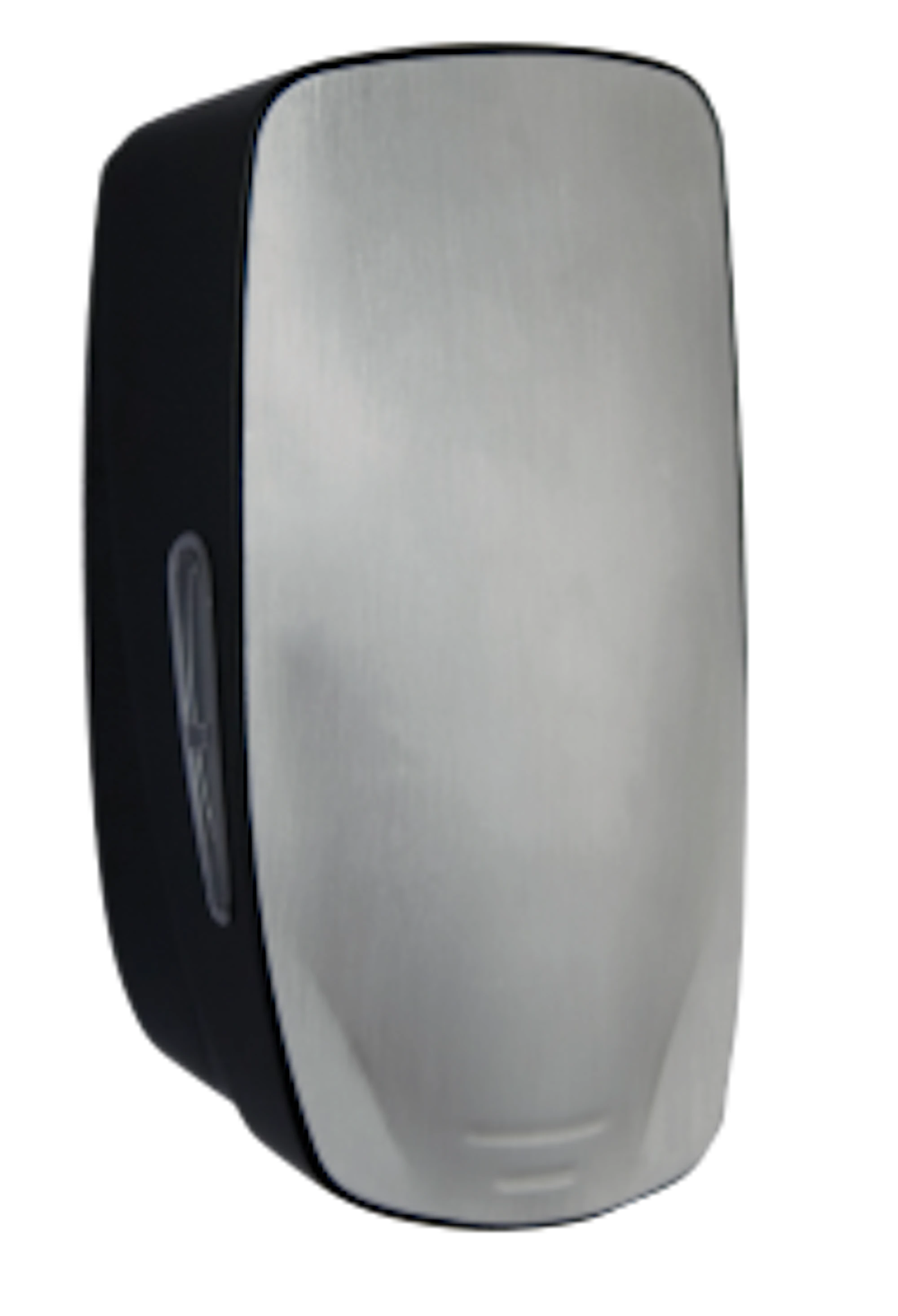 The Ultimate Lotion Soap Dispenser with a 900ml refillabe reservior less frequient refilling. It features a brushed stainless steel cover on a sleek black dispenser for an executive look.